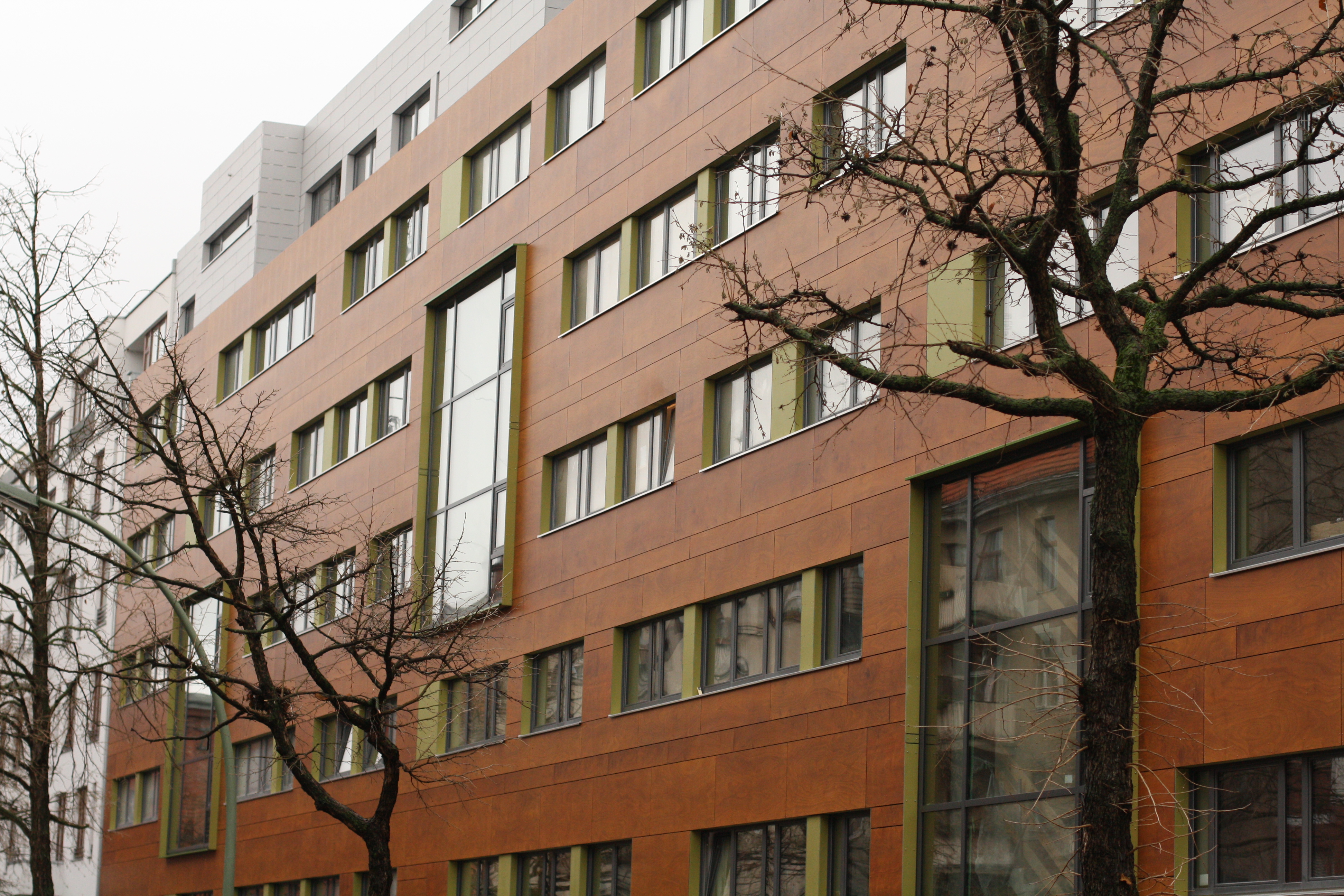 Hinterlüftete Fassadenbekleidung mit HPL-Echtholz und Faserzement auf Unterkonstruktion. Sichtbare Befestigung mittels zu den Fassadentafeln farbgleichen Nieten.